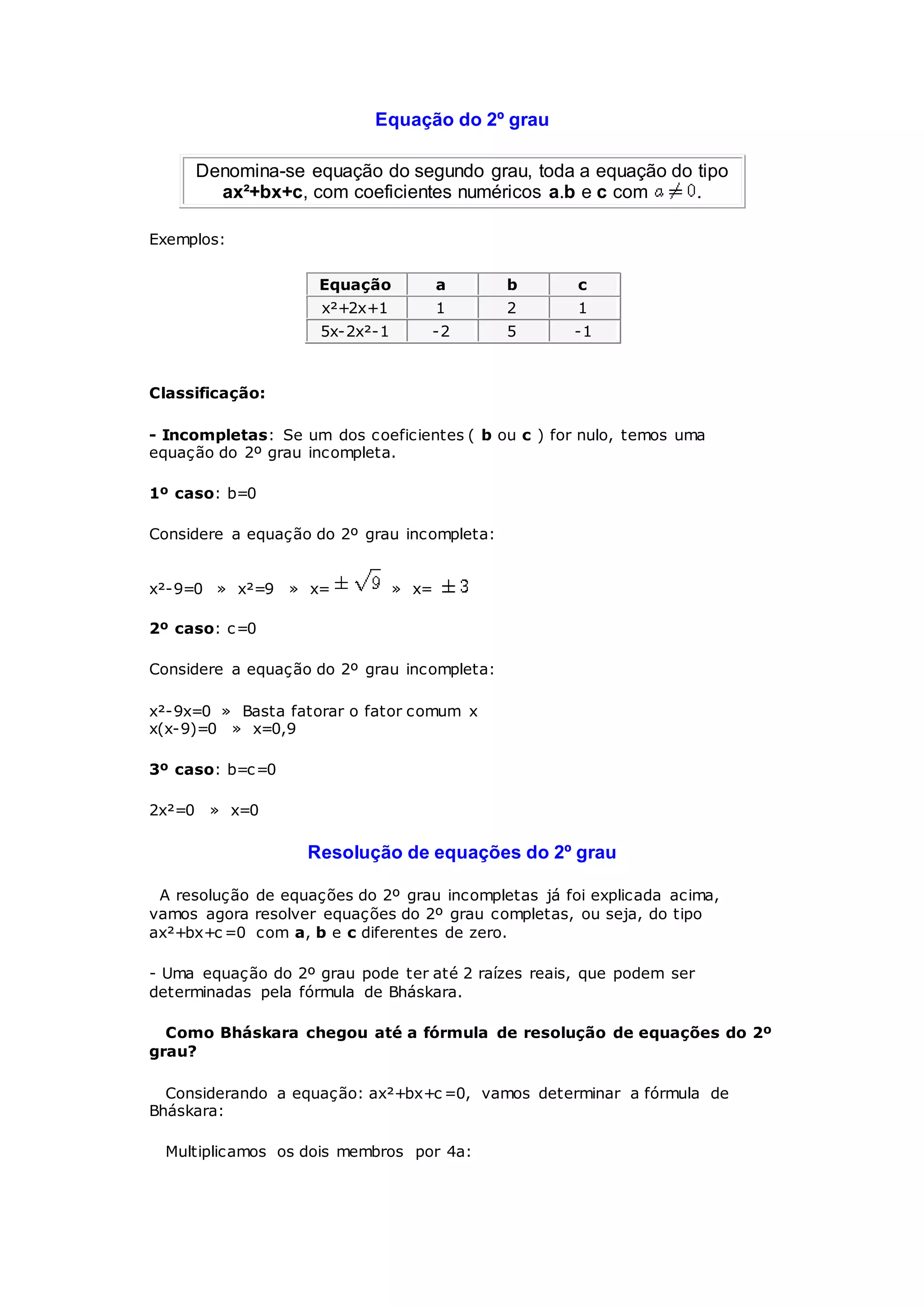 1) O documento descreve os conceitos e métodos para resolver equações do segundo grau, incluindo a fórmula de Bháskara.