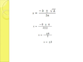 b) x 2 - 6x + 9 = 0 ∆ = (-6) 2 – 4(1)(9) ∆ = 36 – 36 ∆ = 0 A equação possui 2 raízes iguais que podemos dizer que na verdade tem somente uma raiz.