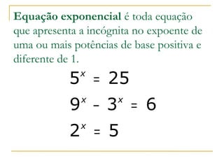 Uma equação exponencial contém uma incógnita no expoente de uma potência. Resolve-se transformando as bases em iguais e usando a propriedade de que a função exponencial é injetora. Exemplos mostram resoluções de equações exponenciais simples e com artifícios de cálculo como mudança de variável. Exercícios são propostos no final.