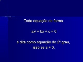 Este documento explica o que é uma equação do 2o grau, fornecendo exemplos e detalhando como calcular as raízes de uma equação quadrática usando a fórmula de Bhaskara. É explicado que uma equação do 2o grau tem a forma geral ax2 + bx + c = 0, com a ≠ 0, e pode ter zero, uma ou duas raízes reais dependendo do valor de ∆.