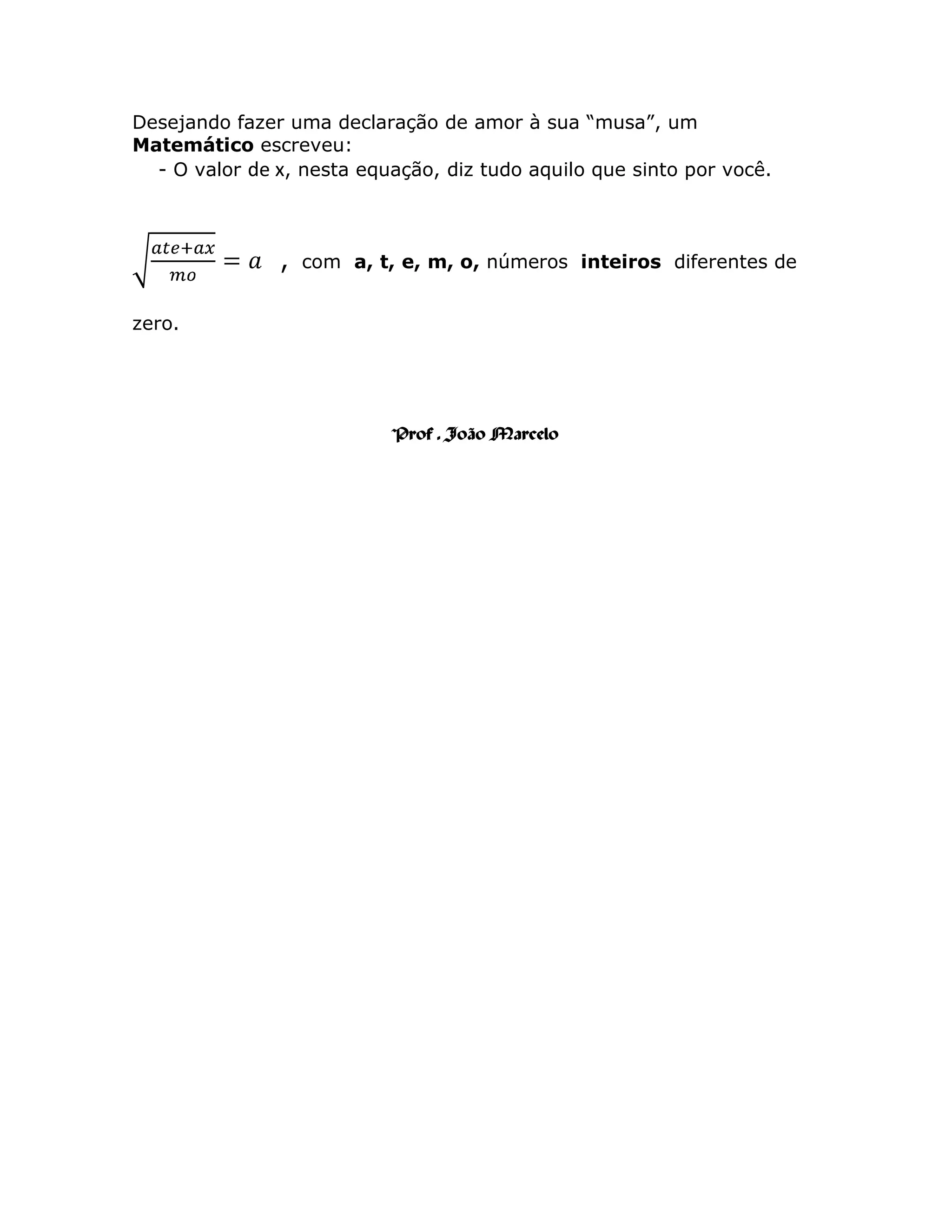 Uma declaração de amor de um matemático para sua musa foi expressa através de uma equação matemática onde os valores de x representam seus sentimentos e os números a, t, e, m, o formam palavras de amor.