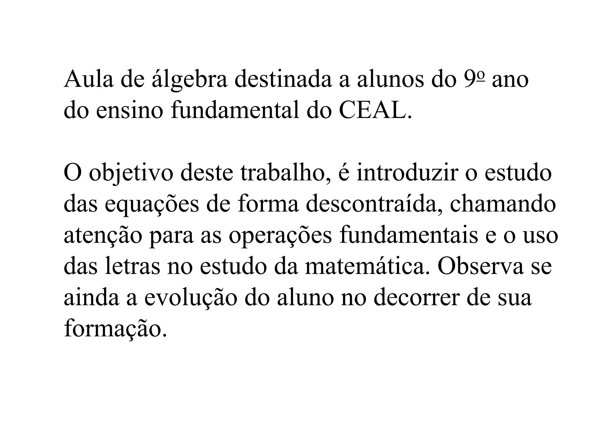 O documento apresenta uma aula sobre equações algébricas do 1o e 2o grau destinada a alunos do 9o ano. Introduz o conceito de equações algébricas e explica como resolver equações do 1o grau por meio de operações algébricas básicas. Também apresenta a fórmula geral para equações do 2o grau e explica como calcular o discriminante para determinar o número de raízes.