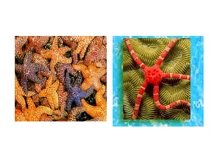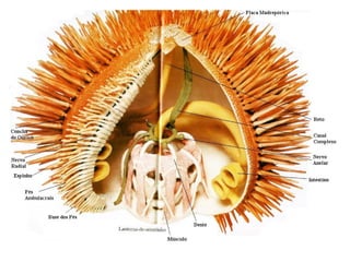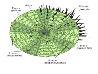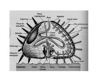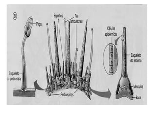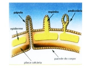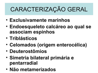 Os equinodermos são exclusivamente marinhos, com endoesqueleto calcário e espinhos, pentarradiais e sem metamerização. Incluem estrelas-do-mar, ouriços-do-mar, pepinos-do-mar, lírios-do-mar e serpentes-do-mar, que respiram, se alimentam e se reproduzem no mar, mas não possuem um sistema circulatório organizado.