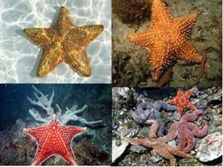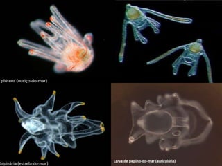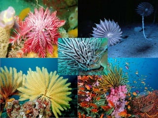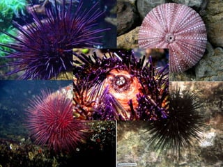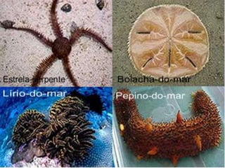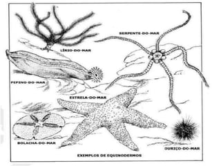 O documento resume as principais características dos equinodermos, incluindo sua classificação em cinco classes, anatomia, sistemas e reprodução. Os equinodermos são exclusivamente marinhos e possuem o corpo recoberto por espinhos. Apresentam simetria radial e sistema aquífero para locomoção e trocas gasosas.