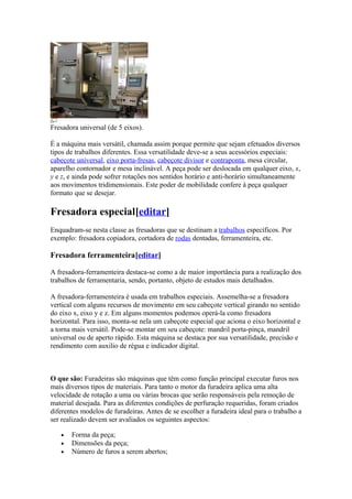 1) A máquina fresadora permite realizar uma grande variedade de trabalhos tridimensionais com rapidez e precisão através do uso de ferramentas múltiplas montadas em um eixo.