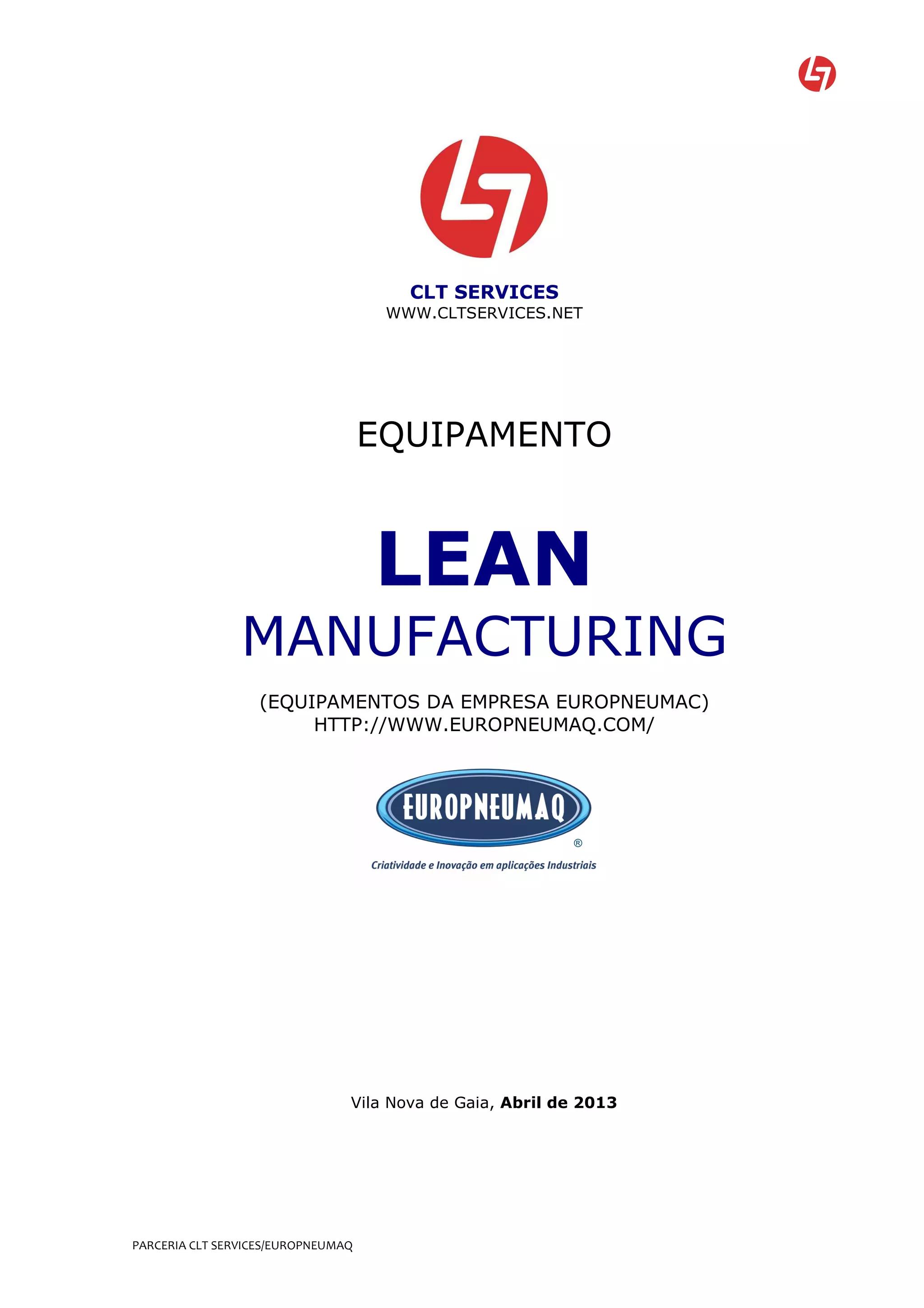 A parceria entre a CLT SERVICES e a EUROPNEUMAQ visa implementar sistemas de manufatura enxuta (lean manufacturing) nas empresas, fornecendo equipamentos, consultoria e formação. A documento descreve vários conceitos e ferramentas lean como quadros de informação visual, 5S, supermercado de produção, sistemas FIFO e fornece contatos para mais informações.