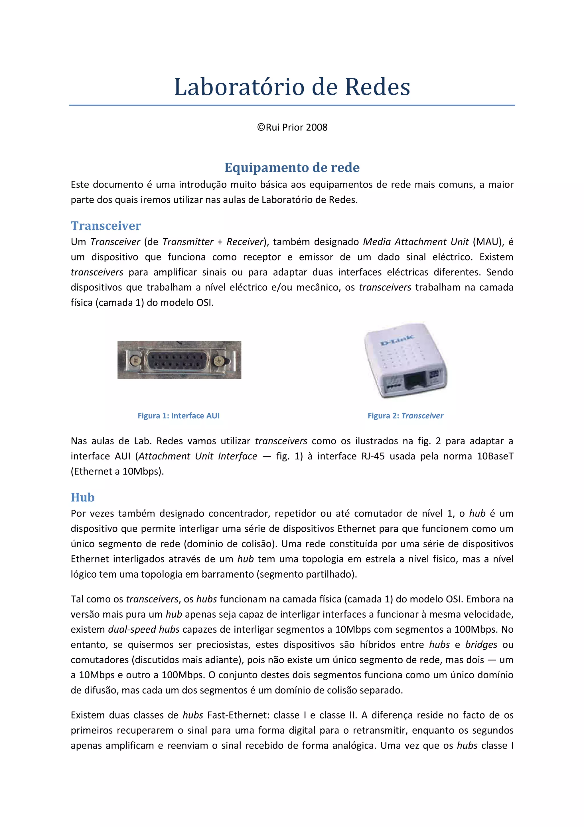 Este documento introduz os equipamentos de rede mais comuns, incluindo transceivers que adaptam diferentes interfaces, hubs que interligam dispositivos em rede, bridges que conectam segmentos de rede, switches que comutam tráfego baseado em endereços MAC, pontos de acesso para redes sem fio, routers que encaminham pacotes entre redes, NAT boxes que traduzem endereços IP, firewalls que inspecionam e filtram tráfego de rede, e servidores que fornecem serviços de rede.