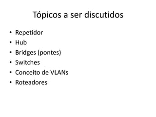 O documento discute equipamentos de rede como repetidores, hubs, bridges, switches e roteadores. Ele também aborda o conceito de VLANs. O documento fornece detalhes sobre como os repetidores funcionam na camada física regenerando sinais para manter a integridade dos dados.