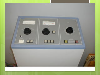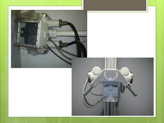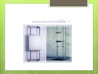 O documento lista e descreve diversos equipamentos e acessórios de radiologia, incluindo ampolas de raios-x, aparelhos fixos e móveis, componentes básicos, mesas de exame, colimadores, chassis radiográficos e detalhes de controle. Informações de contato da autora são fornecidas no final.