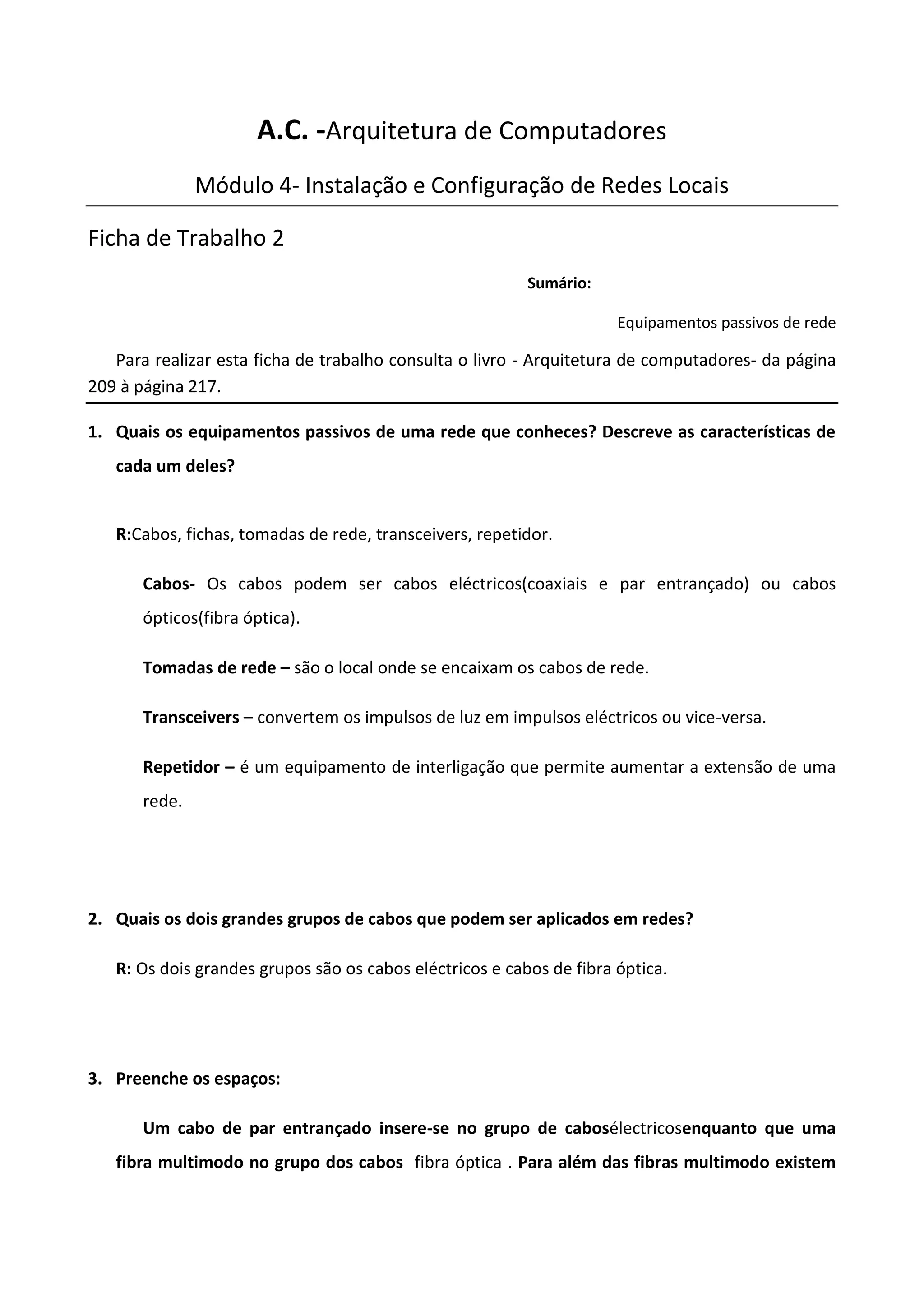 Este documento discute equipamentos passivos de rede, incluindo cabos, tomadas de rede, transceivers e repetidores. Ele fornece detalhes sobre os tipos de cabos, incluindo cabos elétricos e de fibra óptica, e categorias de cabos UTP com suas taxas de transferência e distâncias máximas.