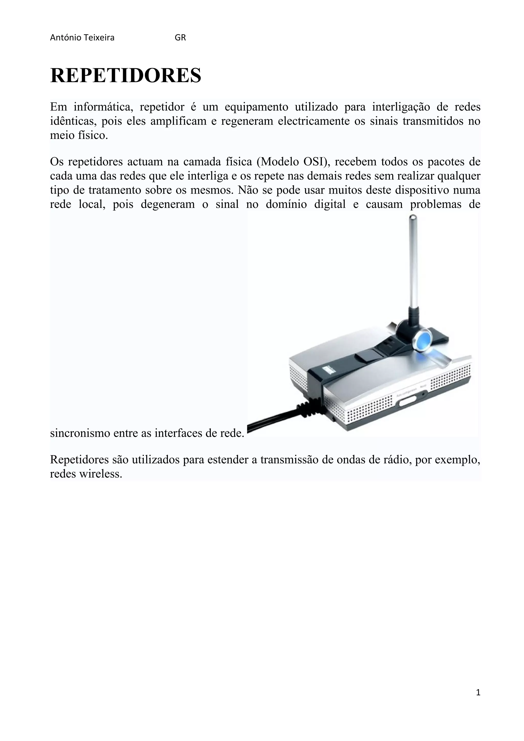 O documento discute os conceitos de repetidores, hubs, switches e bridges. Repetidores amplificam sinais em redes, enquanto hubs simplesmente retransmitem dados em todas as portas. Switches fazem o encaminhamento de dados de forma inteligente baseado em endereços MAC, ao contrário de hubs. Bridges conectam redes diferentes filtrando tráfego entre segmentos.