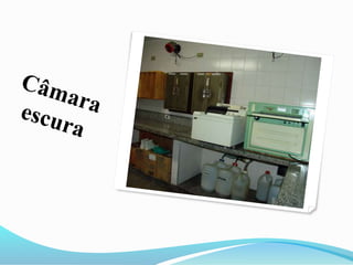 O documento fornece informações sobre os requisitos e equipamentos necessários em uma câmara escura para processamento de filmes radiográficos. A câmara escura deve ter espaço amplo, ser à prova de luz, bem ventilada e climatizada, com tanques para soluções químicas e mesa de trabalho. Deve conter iluminação segura e equipamentos como processadora, revelador, fixador e acessórios para manipulação dos filmes.