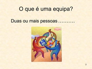 O documento define uma equipa como um grupo de pessoas que trabalham para alcançar um objetivo comum e descreve as diversas funções que os integrantes desempenham, incluindo funções construtivas, de apoio e não-produtivas. Ele destaca a importância da dinâmica de grupo e respeito mútuo para o sucesso da equipa. A conclusão afirma que quando pessoas se unem com um objetivo compartilhado, têm boas chances de sucesso.