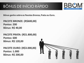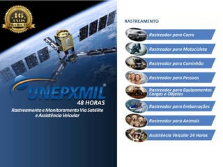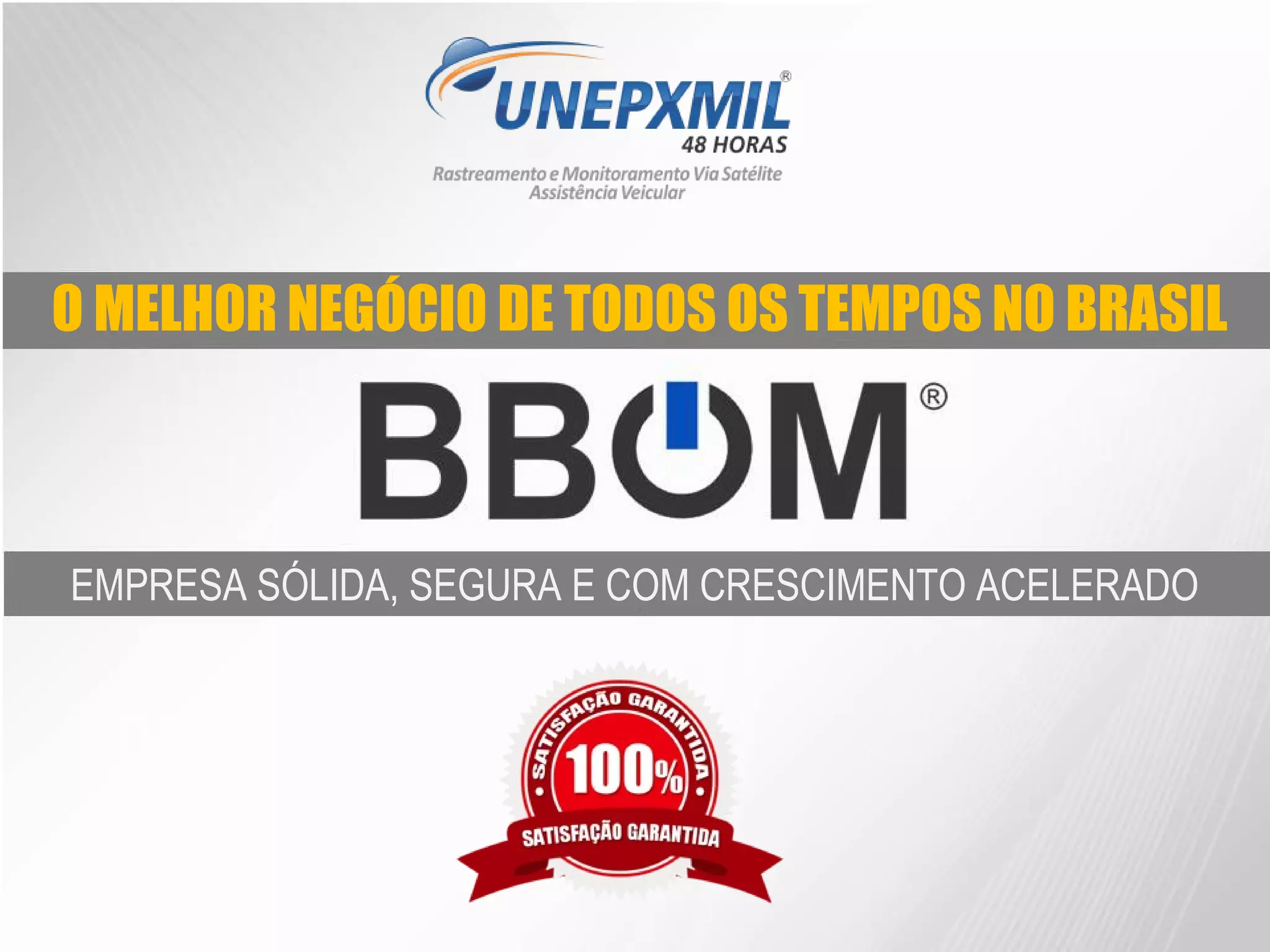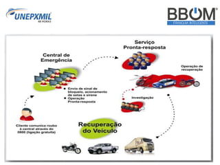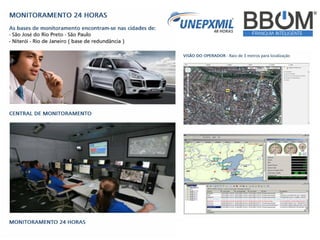 O documento descreve uma empresa de rastreamento e monitoramento de veículos chamada UNEPXMIL 48 HORAS, que oferece oportunidades de franquia através de sua marca BBOM. A empresa possui mais de 16 anos de experiência no mercado brasileiro e é líder em retorno de investimento. O modelo de negócio envolve o aluguel de dispositivos de rastreamento para clientes, com os franqueados recebendo uma porcentagem dos valores pagos.