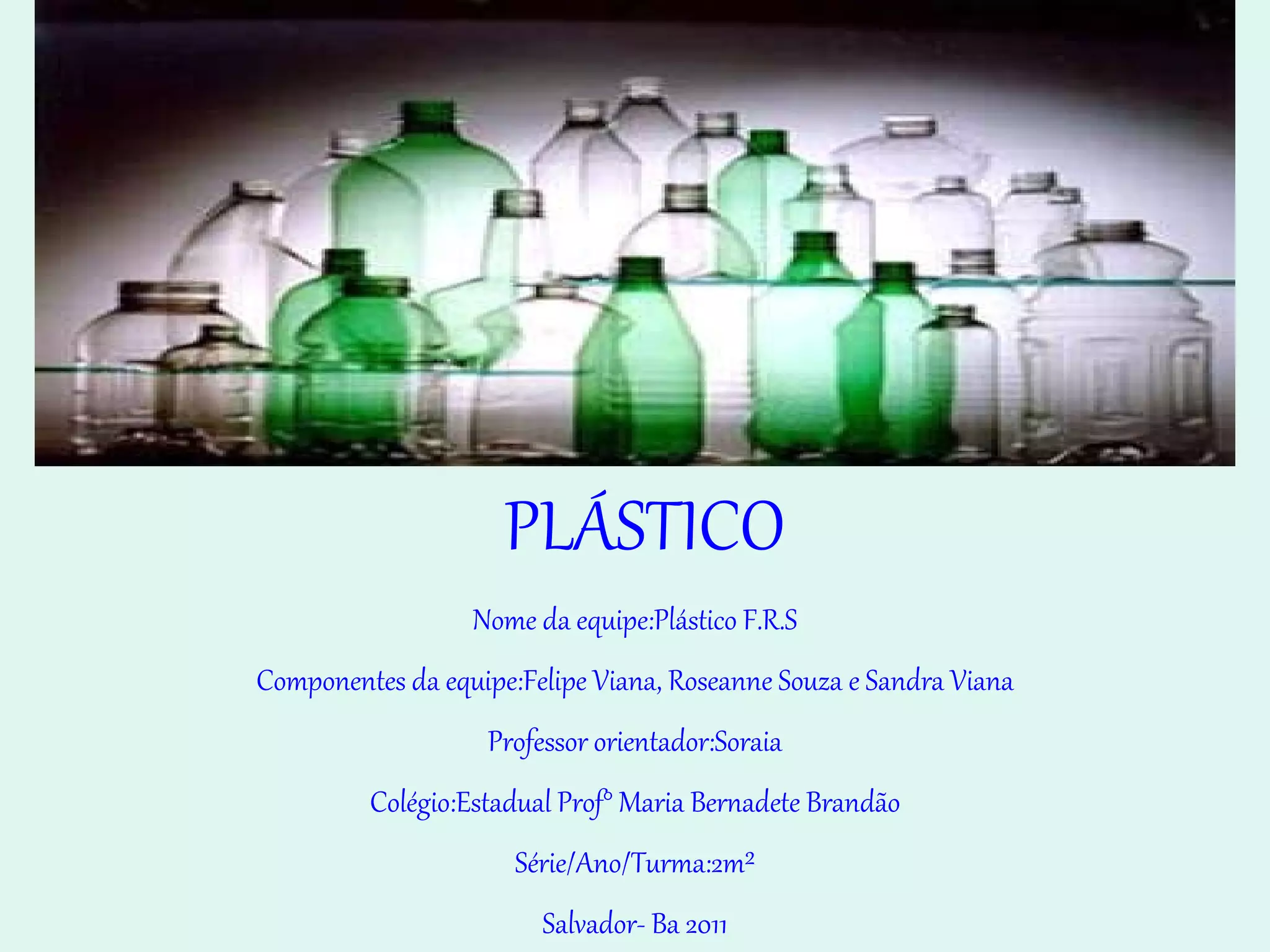 Este documento descreve um projeto de pesquisa realizado por estudantes sobre a reciclagem de plástico. O projeto teve como objetivo despertar a consciência ambiental dos colegas sobre a importância de reutilizar o plástico através da criação de objetos como uma maçã, uma jardineira e um porta-lápis feitos com garrafas PET.
