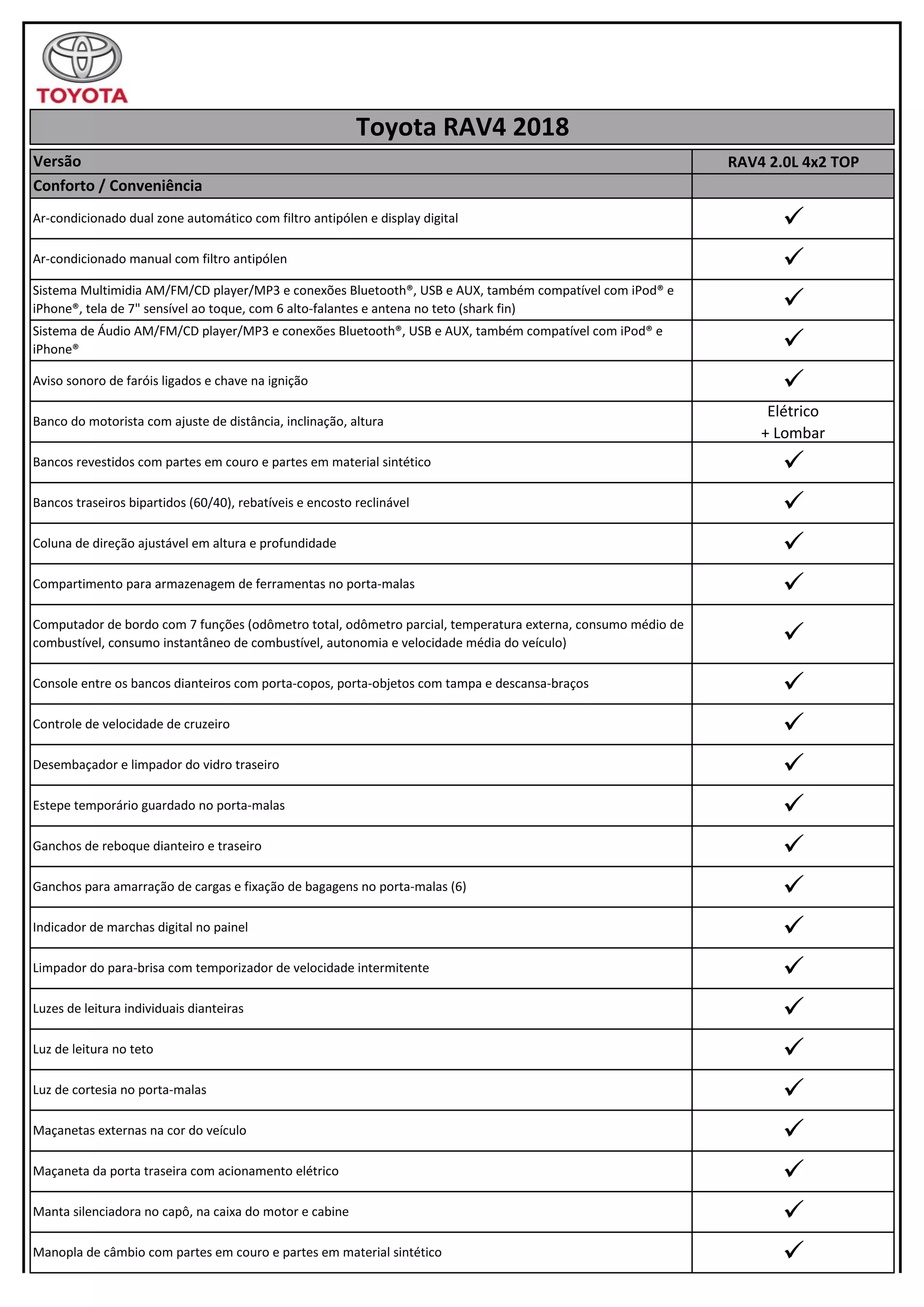 Este documento lista as especificações e recursos de um Toyota RAV4 2.0L 4x2 TOP 2018, incluindo detalhes sobre segurança, conforto, estilo e sistema multimídia.