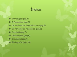O documento descreve a Era Paleozóica, dividida em seis períodos. Cada período teve características únicas de clima, flora e fauna, observando-se grandes transformações ao longo da era, como a evolução dos primeiros animais para as plantas terrestres e répteis. A era terminou com a maior extinção em massa devido a mudanças climáticas e um possível impacto de meteorito.