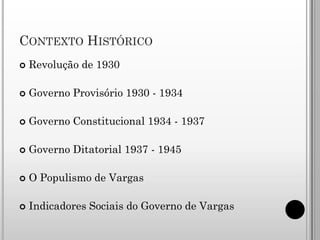 O documento descreve o período da Era Vargas no Brasil de 1930 a 1945, dividido em três fases: Governo Provisório, Governo Constitucional e Governo Ditatorial. Vargas promoveu a industrialização do país, os direitos trabalhistas e a valorização da agricultura, tornando-se conhecido como "Pai dos Pobres".