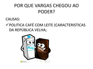 O documento resume a Era Vargas no Brasil de 1930 a 1945. Vargas chegou ao poder após a crise da política cafeeira e da Grande Depressão, governando inicialmente de forma autoritária como chefe de um governo provisório. Posteriormente, estabeleceu um governo constitucional com reformas populares antes de instaurar o Estado Novo, um regime ditatorial e nacionalista que durou até 1945.