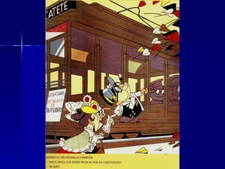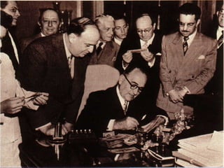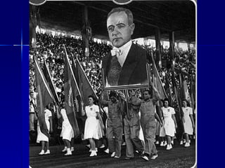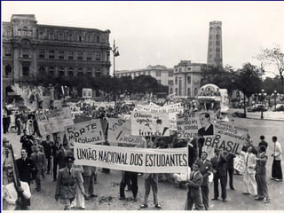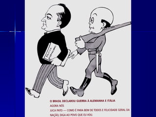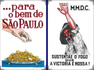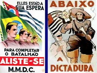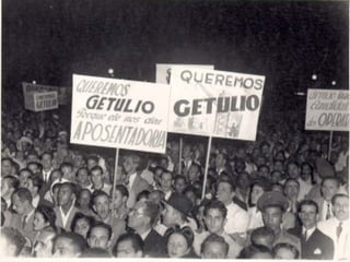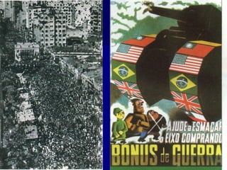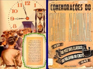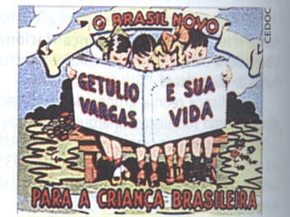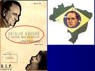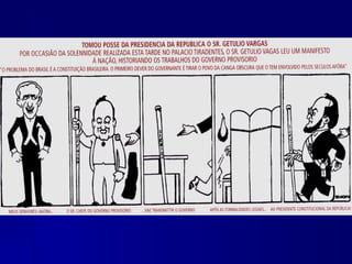 O documento descreve a Revolução de 1930 no Brasil e a subsequente Era Vargas de 1930 a 1945. A Revolução de 1930 resultou na Aliança Liberal chegar ao poder sob Getúlio Vargas. A Era Vargas incluiu o Governo Provisório, Governo Constitucional e o Estado Novo, durante o qual Vargas consolidou o poder e estabeleceu as bases para a industrialização e reformas sociais no Brasil.