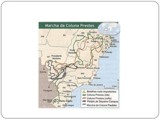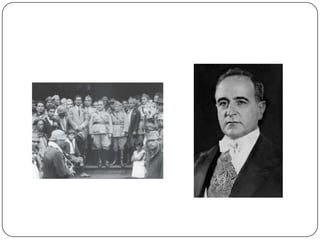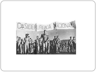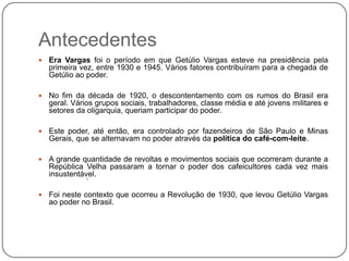 O documento resume a Era Vargas no Brasil, período entre 1930 e 1945 no qual Getúlio Vargas esteve na presidência. Apresenta os antecedentes que levaram Vargas ao poder após a Revolução de 1930, como o descontentamento popular com a política do café-com-leite e as revoltas durante a República Velha. Detalha os principais momentos do governo Vargas, incluindo o Governo Provisório, a Revolução Constitucionalista, a Constituição de 1934, o Governo Constitucional e a implantação do Estado Novo em 1937.