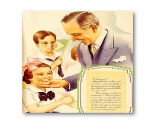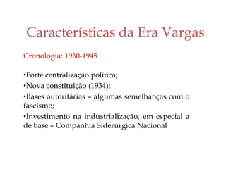 O documento descreve o período da Era Vargas no Brasil, desde a Revolução de 1930 que levou Getúlio Vargas ao poder até o fim do Estado Novo em 1945. Destaca-se a forte centralização política e autoritarismo do regime, a promulgação de novas constituições em 1934 e 1937, e os esforços de industrialização e regulamentação trabalhista durante esse período.