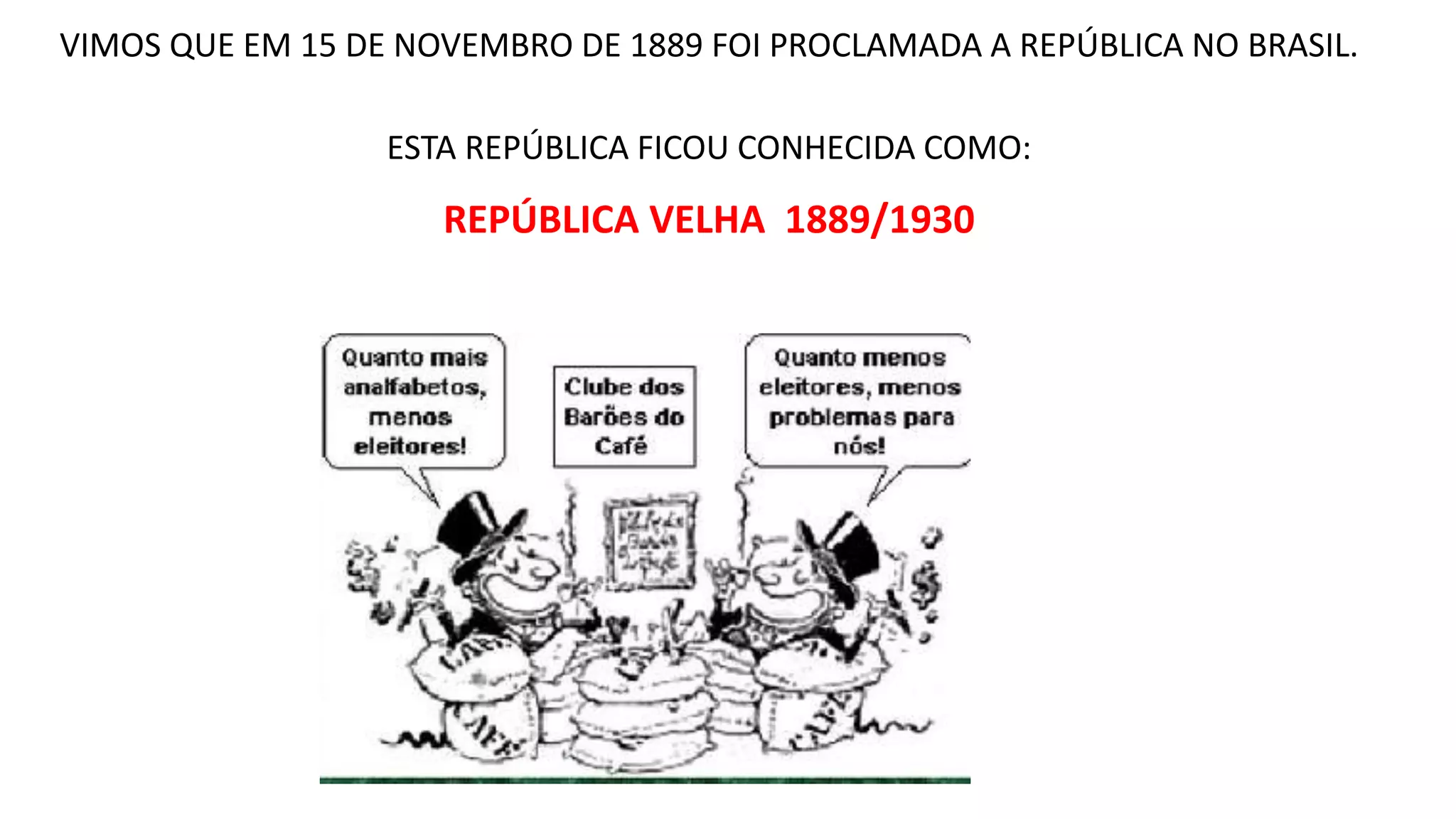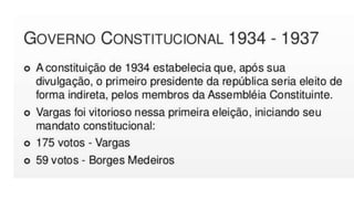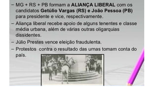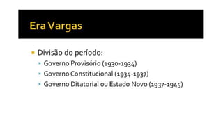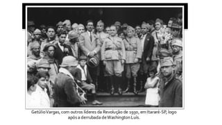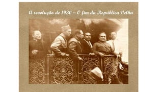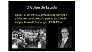 A República Velha no Brasil durou de 1889 a 1930 e foi marcada por fraudes eleitorais e instabilidade política. Getúlio Vargas liderou um golpe de estado em 1930 que pôs fim a este período e estabeleceu um governo provisório autoritário, centralizando o poder. Embora reprimisse a oposição, Vargas modernizou a burocracia e estabeleceu novas leis trabalhistas e de educação.