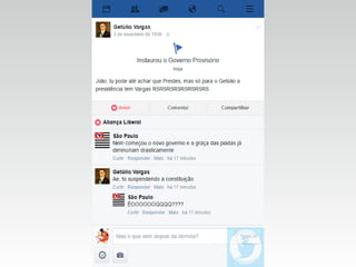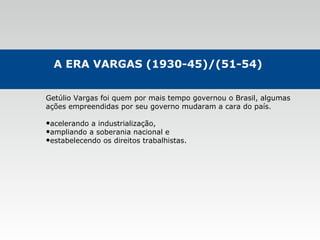 O documento descreve o período da Era Vargas no Brasil de 1930 a 1954, durante o qual Getúlio Vargas governou o país. O texto destaca três principais ações do governo Vargas: 1) acelerar a industrialização, 2) ampliar a soberania nacional e 3) estabelecer direitos trabalhistas. O documento também resume os principais eventos políticos do período como a Revolução de 1930, a Revolução Constitucionalista de 1932 e a implantação do Estado Novo em 1937.