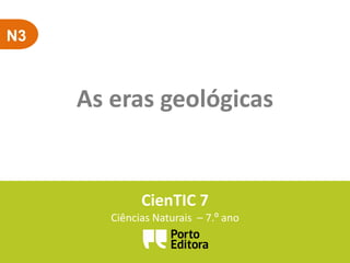 O documento divide o tempo geológico em quatro eras - Pré-Câmbrico, Paleozoico, Mesozoico e Cenozoico. Cada era é caracterizada por eventos evolutivos importantes como o aparecimento dos primeiros seres vivos, plantas, répteis e mamíferos. A última era, Cenozoico, vai dos últimos 65 milhões de anos até hoje e viu a diversificação de mamíferos, aves e plantas com flor, bem como o aparecimento dos hominídeos.