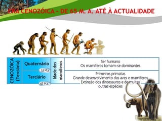 A Escala Cronoestratigráfica divide a história da Terra em Eras, Períodos e Épocas com base na idade e características das rochas. A Escala inclui a Pré-Câmbrica, Paleozóica, Mesozóica e Cenozóica, marcadas por eventos como a evolução da vida, era dos dinossauros e ascensão dos mamíferos.