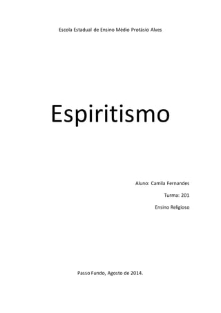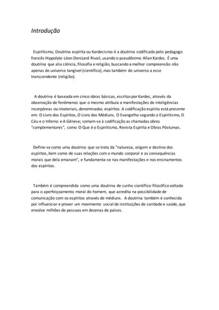 O documento descreve os principais aspectos da doutrina espírita, incluindo sua história, princípios, presença no Brasil e no mundo, e o movimento espírita. A doutrina foi codificada por Allan Kardec com base em comunicações com espíritos e abrange a existência de Deus, a sobrevivência do espírito após a morte, a reencarnação, e a evolução moral e intelectual dos espíritos. O espiritismo se espalhou para vários países e teve grande aceitação no Brasil, em parte