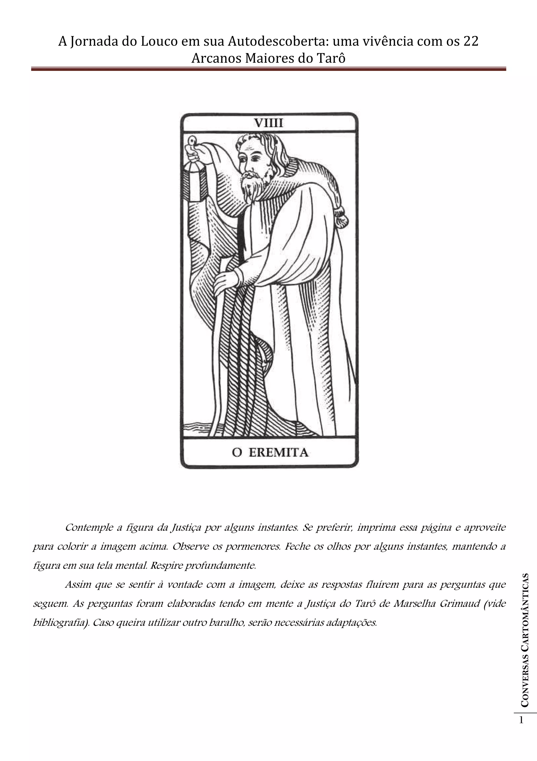 Este documento descreve uma vivência guiada pelos 22 Arcanos Maiores do Tarô para autodescoberta e planejamento pessoal. O leitor é convidado a refletir sobre questões existenciais a partir das imagens e significados de cada arcano, como o Eremita, a Roda da Fortuna e a Justiça. O objetivo é promover o autoconhecimento e a tomada de decisões conscientes.
