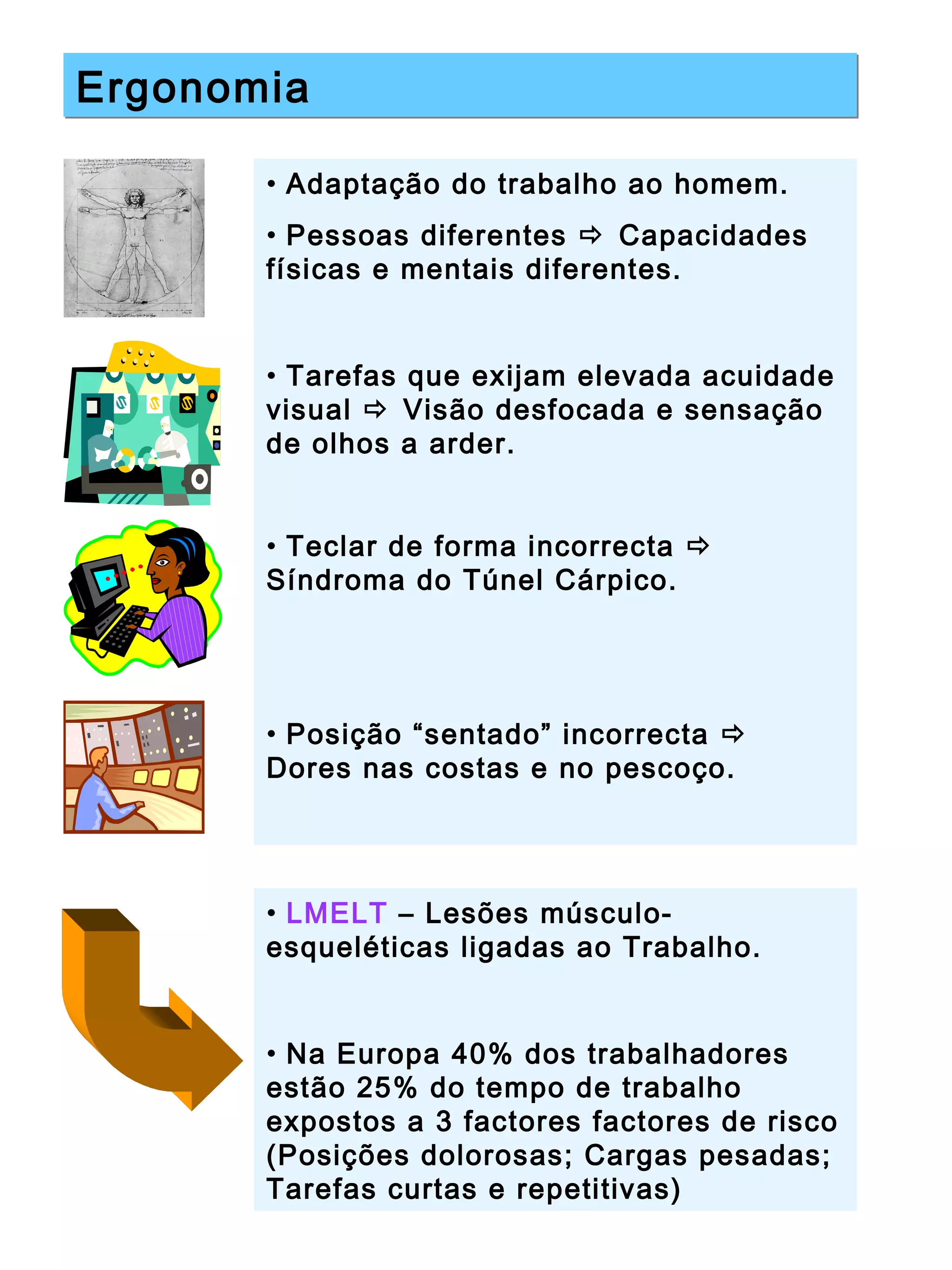O documento discute princípios ergonômicos para adaptação do trabalho ao homem, incluindo posições de trabalho adequadas para evitar lesões. É destacada a importância de se considerar as diferenças individuais e de se projetar tarefas, ferramentas e ambientes de trabalho que minimizem riscos à saúde.