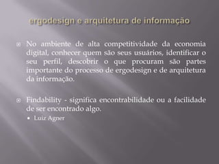 O documento discute os conceitos de ergodesign e arquitetura da informação, definindo-os como abordagens focadas no usuário para tornar interfaces e informações acessíveis. Também apresenta 15 lições de design de interface e 9 regras de ouro para projeto, enfatizando a importância de conhecer os usuários e seus diferentes perfis.