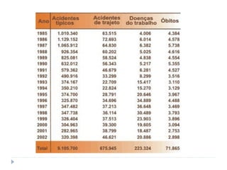 O documento discute ergonomia no trabalho e doenças relacionadas ao trabalho. Apresenta os tipos de acidentes de trabalho e distúrbios frequentes como lombalgias e tendinites. Discute fatores de risco multicausais para doenças ocupacionais e medidas preventivas como mobiliário, equipamentos de proteção individual e ginástica laboral. Conclui que é necessária uma abordagem multidisciplinar para promover a saúde do trabalhador.