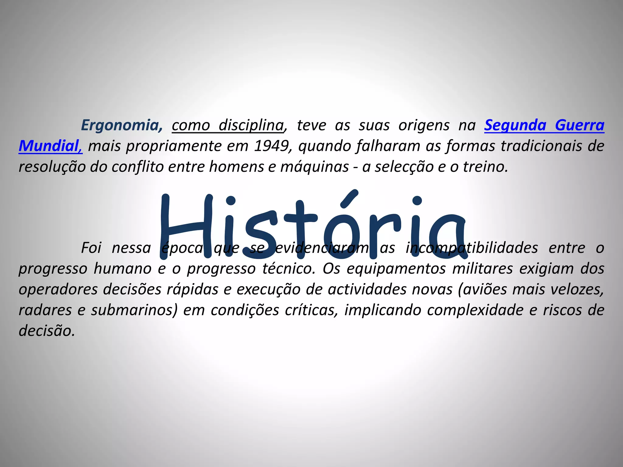 O documento descreve a história e origens da ergonomia, desde a Segunda Guerra Mundial, quando as máquinas complexas não correspondiam às capacidades humanas. Definiu-se então ergonomia como a ciência que estuda a interação homem-máquina de forma a maximizar o desempenho e bem-estar humano. O texto também aborda princípios ergonômicos relacionados a posturas corporais e como alternar entre sentado e em pé para evitar fadiga.