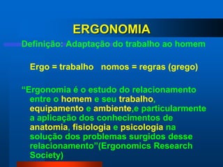 O documento discute a ergonomia e ginástica laboral. A ergonomia é definida como a adaptação do trabalho ao homem, analisando a relação entre o homem, seu trabalho, equipamento e ambiente. A ginástica laboral tem como objetivo melhorar a saúde dos funcionários, o desempenho e reduzir doenças ocupacionais através de exercícios preparatórios, compensatórios e de relaxamento.