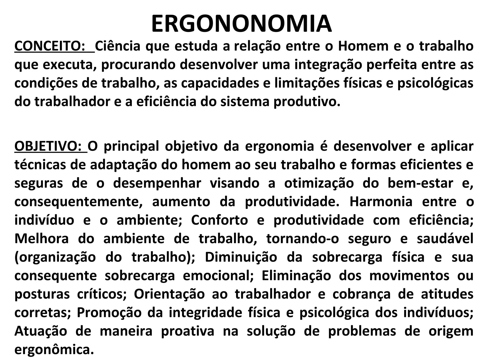 O documento discute ergonomia, definindo-a como a ciência que estuda a relação entre o homem e o trabalho. A ergonomia objetiva desenvolver uma integração perfeita entre as condições de trabalho, as capacidades do trabalhador e a eficiência do sistema produtivo, visando o bem-estar do trabalhador e aumento da produtividade.