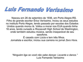 Luis Fernando Verissimo nasceu em Porto Alegre em 1936 e é filho do escritor Érico Verissimo. Estudou no Brasil e nos Estados Unidos, onde morou por duas vezes e cursou a Roosevelt High School em Washington. Atualmente é casado, tem três filhos e trabalha como jornalista e escritor, tendo iniciado sua carreira no jornal Zero Hora.