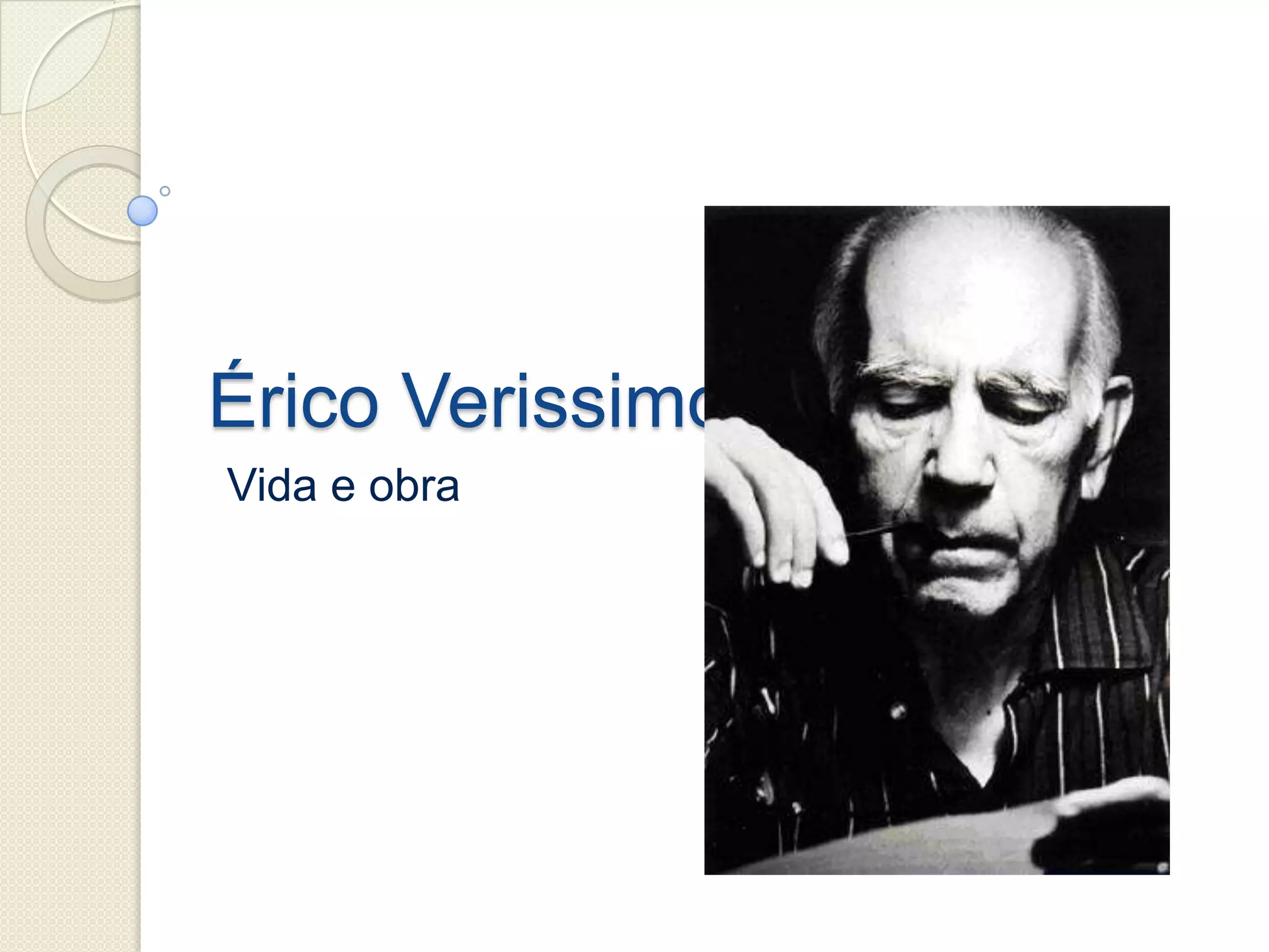 O documento resume a vida e obra do escritor brasileiro Érico Verissimo. Ele nasceu em 1905 no Rio Grande do Sul e publicou seu primeiro conto em 1929. Seu romance mais famoso foi a trilogia "O Tempo e o Vento", publicada entre 1949-1961, que narra a história do Rio Grande do Sul por duzentos anos. Verissimo foi um dos primeiros escritores brasileiros a viver apenas da literatura.
