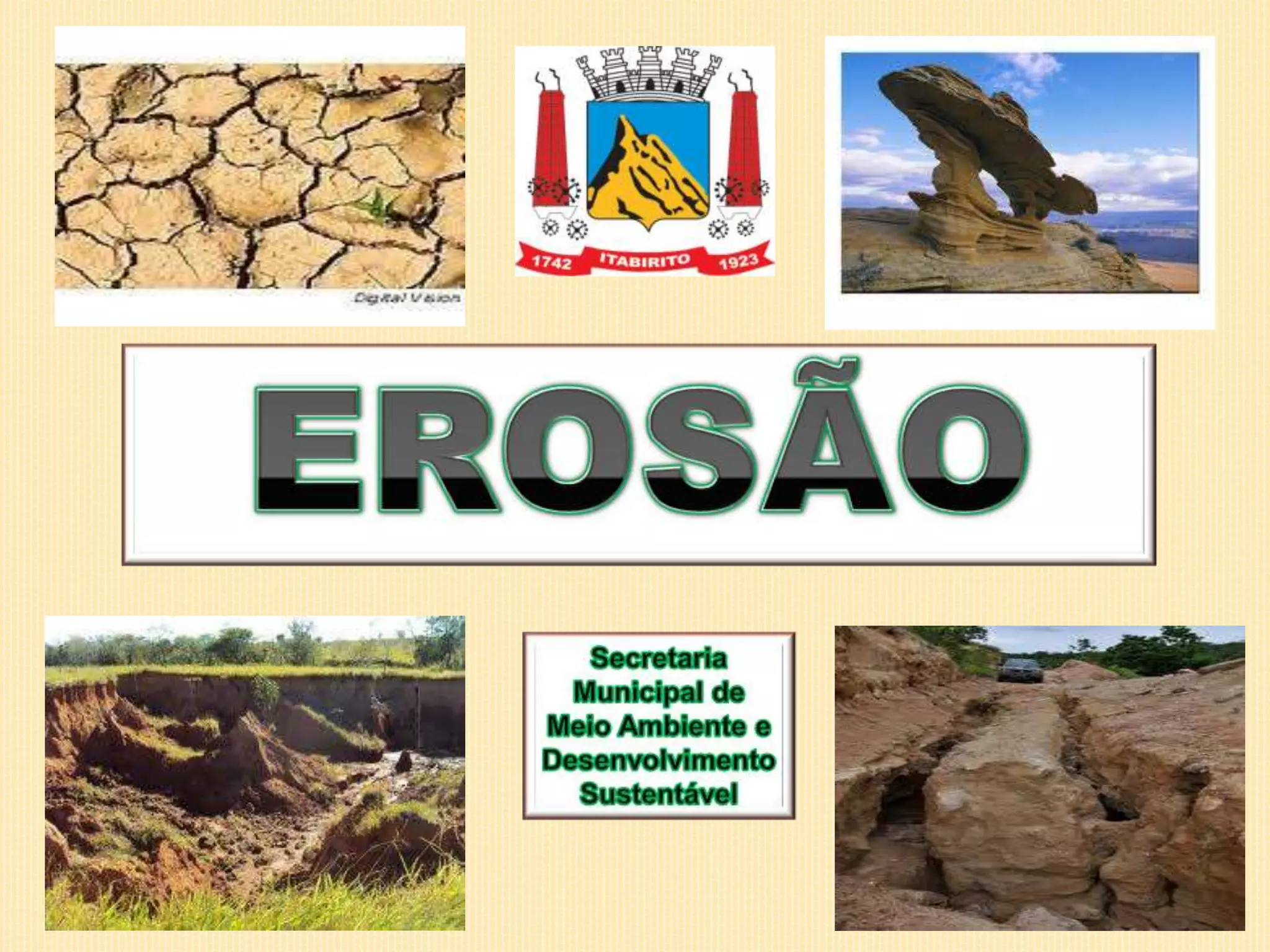 Este documento descreve o processo de erosão, definindo-o como a destruição e transporte do solo e rochas pela água, vento ou gelo. A erosão destrói a estrutura do solo e transporta os materiais para áreas mais baixas, causando assoreamento em cursos d'água. A erosão é um problema quando o solo é exposto devido à remoção da vegetação, podendo levar à desertificação. O documento também discute os tipos e fatores de erosão e suas consequências, além de medidas para evitá-la.