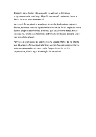 A erosão fluvial ocorre em três fases - desgaste, transporte e acumulação - que dominam diferentes seções do curso do rio. No curso superior, o desgaste domina devido à alta velocidade da água. No curso médio, o transporte é dominante com menor declive. No curso inferior, a acumulação ocorre à medida que a água desacelera.