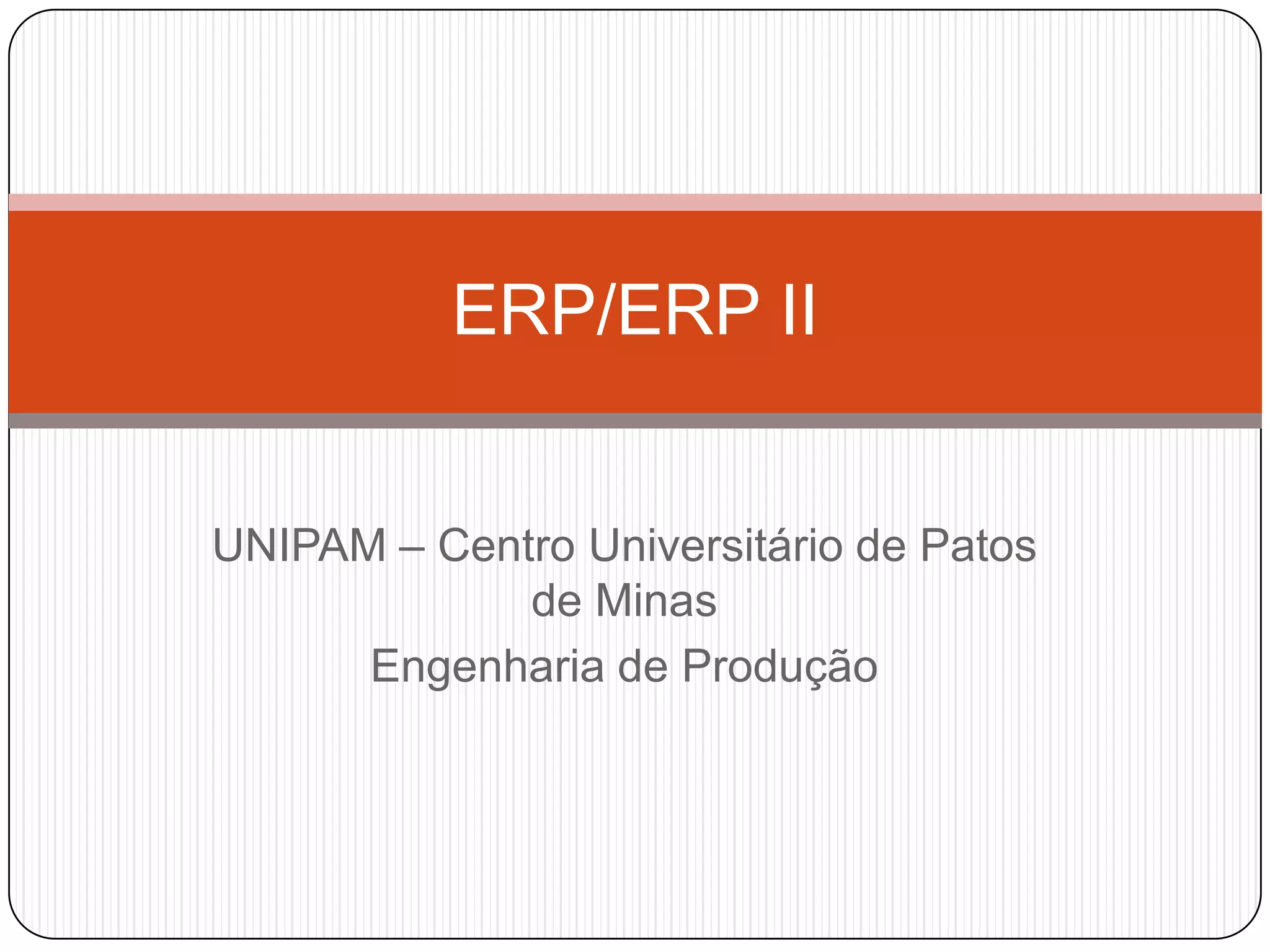 O documento discute ERP e ERP II, definindo-os como sistemas de informação que integram todos os dados e processos de uma organização. Também aborda as vantagens como redução de custos e aumento da eficiência, e desvantagens como altos custos de implementação e dependência do fornecedor. Por fim, discute a importância de manter a identidade da empresa ao implementar um ERP.