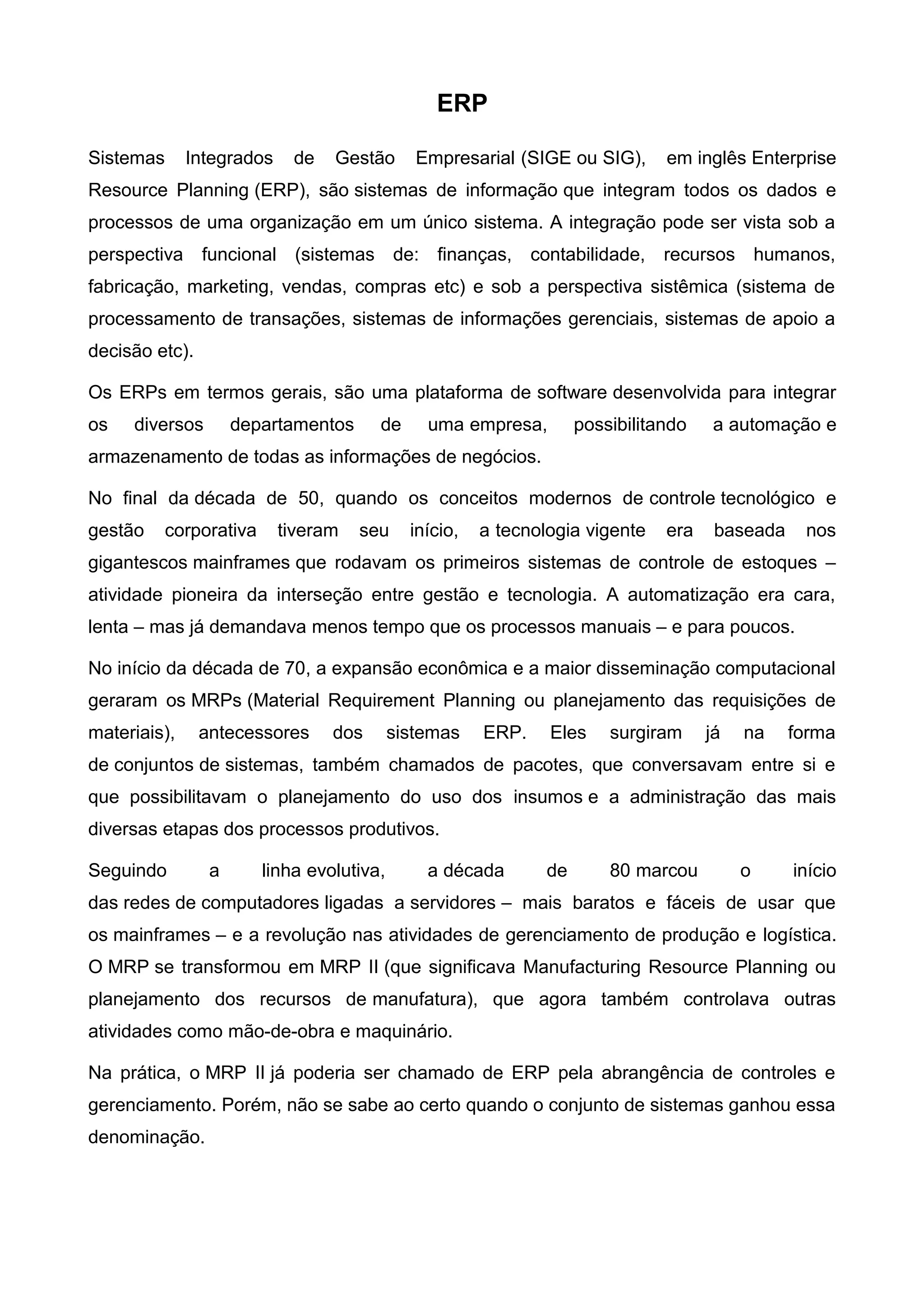 ERP são sistemas de informação que integram todos os dados e processos de uma organização em um único sistema, permitindo a automação e armazenamento de informações de negócios. Eles evoluíram a partir de sistemas de controle de estoques e planejamento de recursos para abranger diversos departamentos de uma empresa. A implementação de um ERP requer análise das necessidades da empresa e customização do sistema.