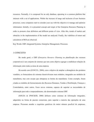 Este documento discute o conceito e evolução dos sistemas ERP. Inicialmente, define ERP como um conjunto de sistemas que facilitam o fluxo de informações entre as diferentes áreas de uma empresa. Em seguida, descreve a origem dos sistemas ERP a partir dos sistemas MRP nas décadas de 1970 e 1980, e como eles se expandiram para abranger mais processos de negócios. Por fim, discute tendências do mercado de ERP e desafios comuns na implementação desses sistemas.