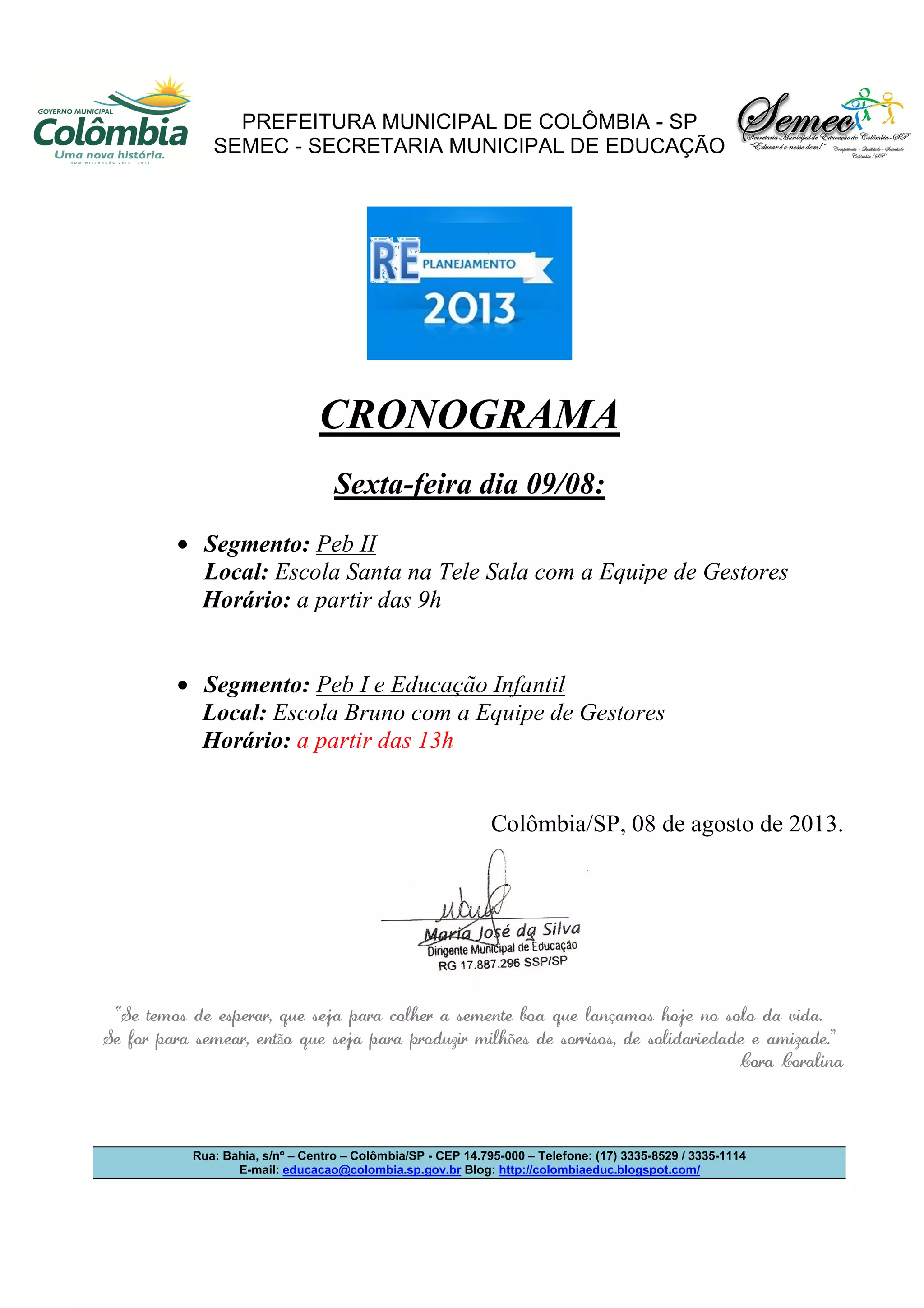 O documento anuncia um cronograma de reuniões da Secretaria Municipal de Educação com equipes de gestores das escolas. Na sexta-feira, dia 09/08, haverá reuniões com o segmento de Peb II na Escola Santa e com Peb I e Educação Infantil na Escola Bruno, a partir das 9h e 13h, respectivamente.