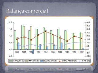 O documento descreve o período da década de 1950 no Brasil, marcado pela eleição de Juscelino Kubitschek e sua implementação do Plano de Metas, incluindo a construção de Brasília. A década também viu avanços científicos e culturais, como o surgimento do rock and roll, além da urbanização acelerada e transformação da economia brasileira.