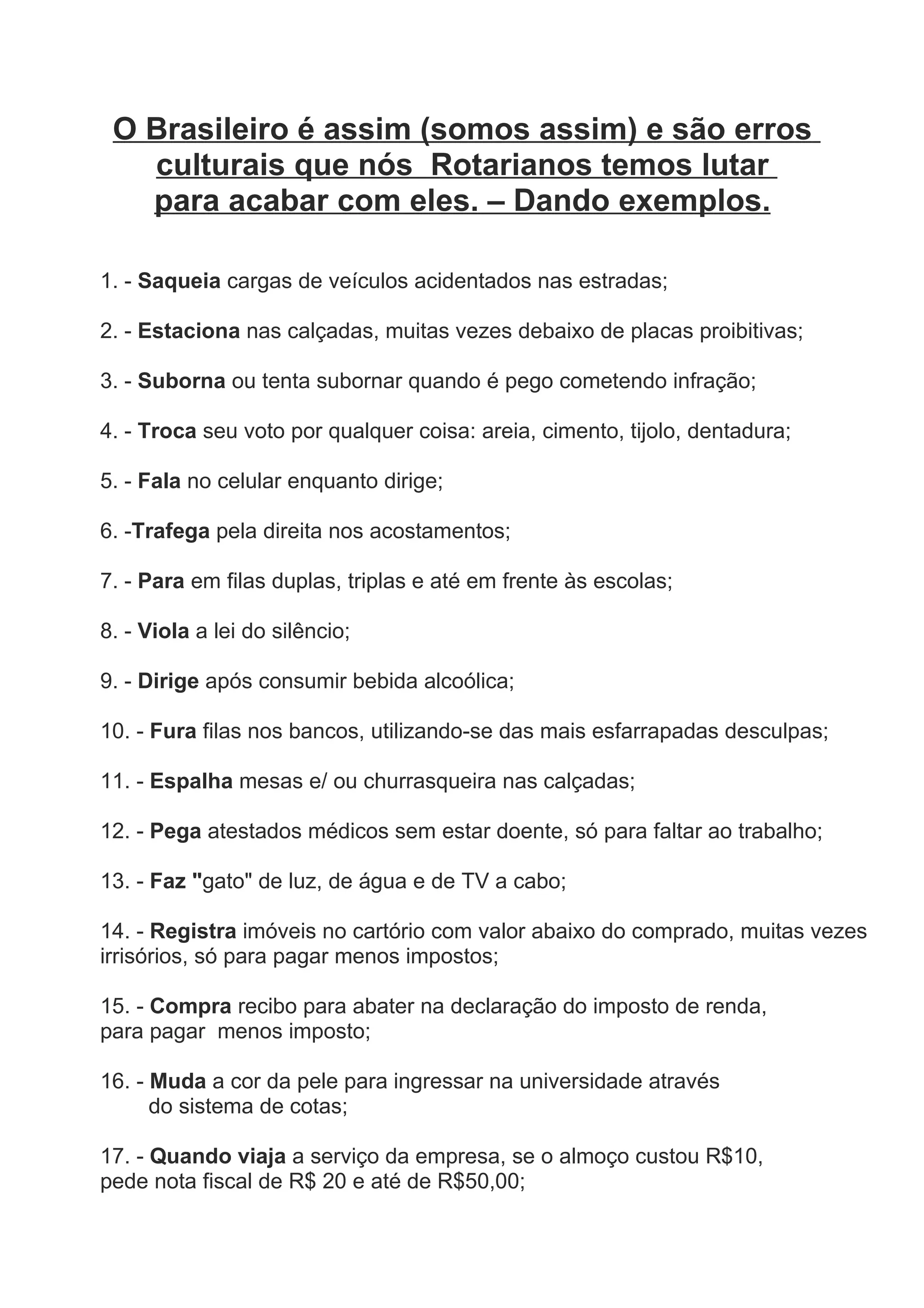 O documento lista 33 erros culturais comuns no Brasil, como saquear cargas de veículos acidentados, estacionar em calçadas, subornar autoridades, trocar votos por benefícios, dirigir sob efeito de álcool, e furar filas de forma desrespeitosa. O texto argumenta que os rotarianos devem lutar para acabar com esses problemas culturais.