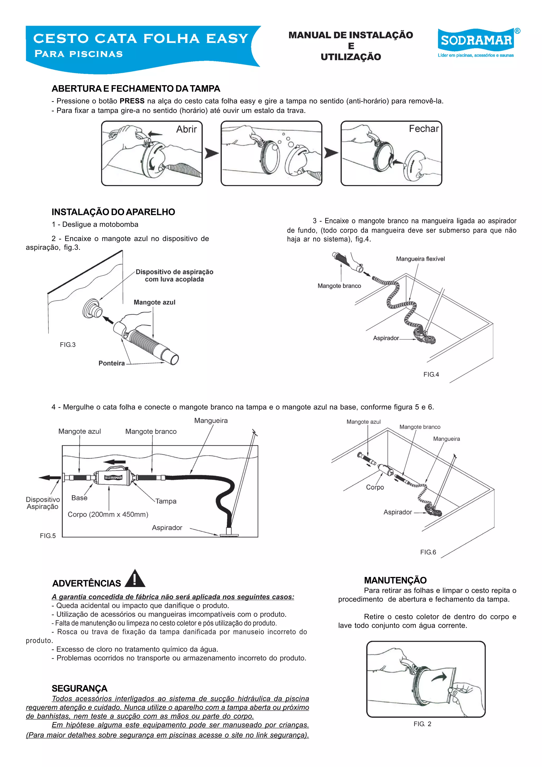 O documento fornece instruções sobre a abertura, fechamento e instalação de um cata-folhas para piscinas. Ele explica como conectar os mangotes ao dispositivo de aspiração e como mergulhar o cata-folhas na água. O documento também alerta sobre situações que invalidam a garantia e sobre a importância de sempre seguir medidas de segurança ao usar o equipamento.
