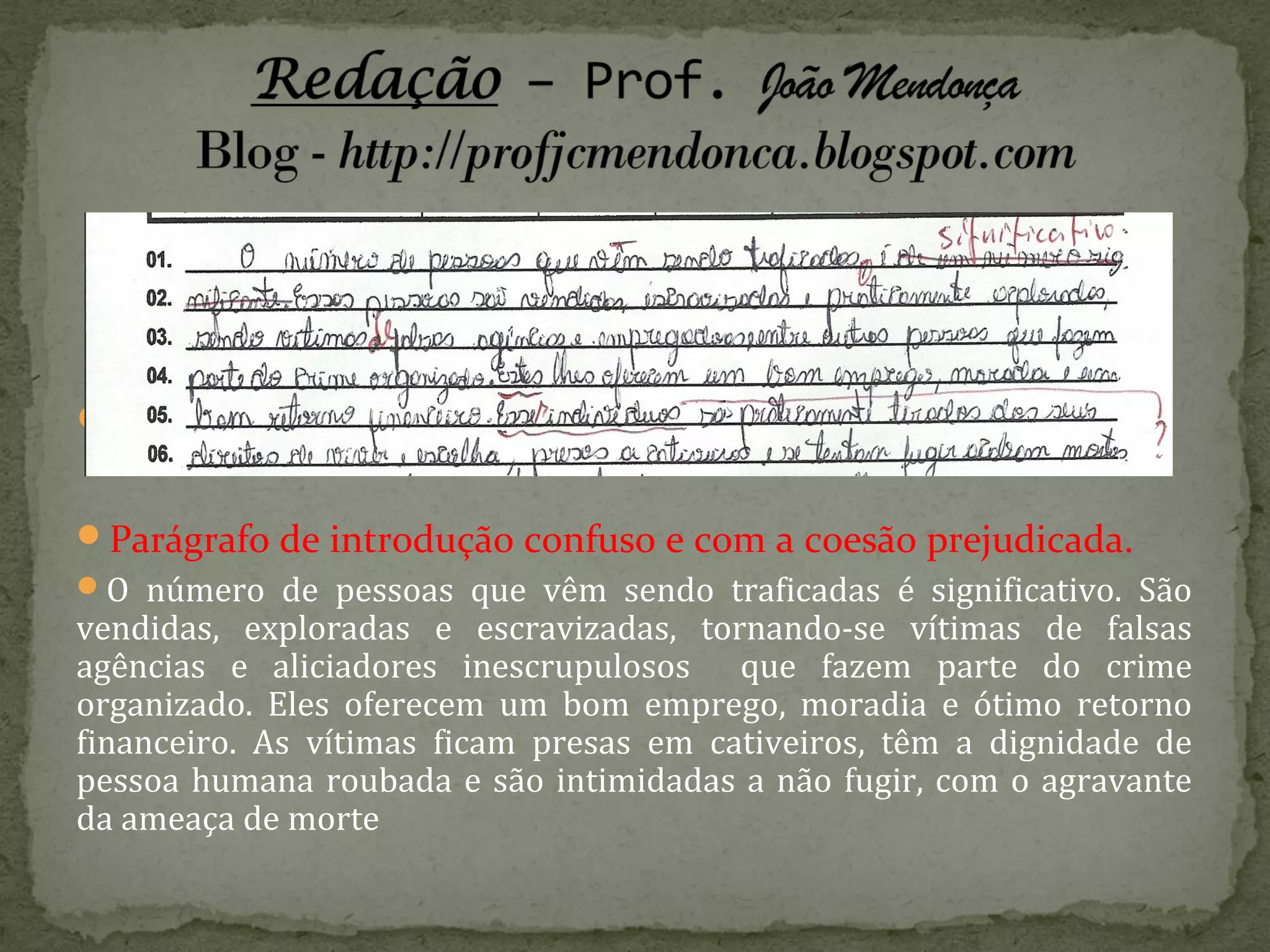 O documento discute o tráfico de pessoas, onde indivíduos são enganados e forçados a trabalhos desumanos. Muitos são atraídos por promessas falsas de emprego no exterior, mas na verdade são escravizados. Campanhas de conscientização e novas táticas policiais são necessárias para combater esse problema.